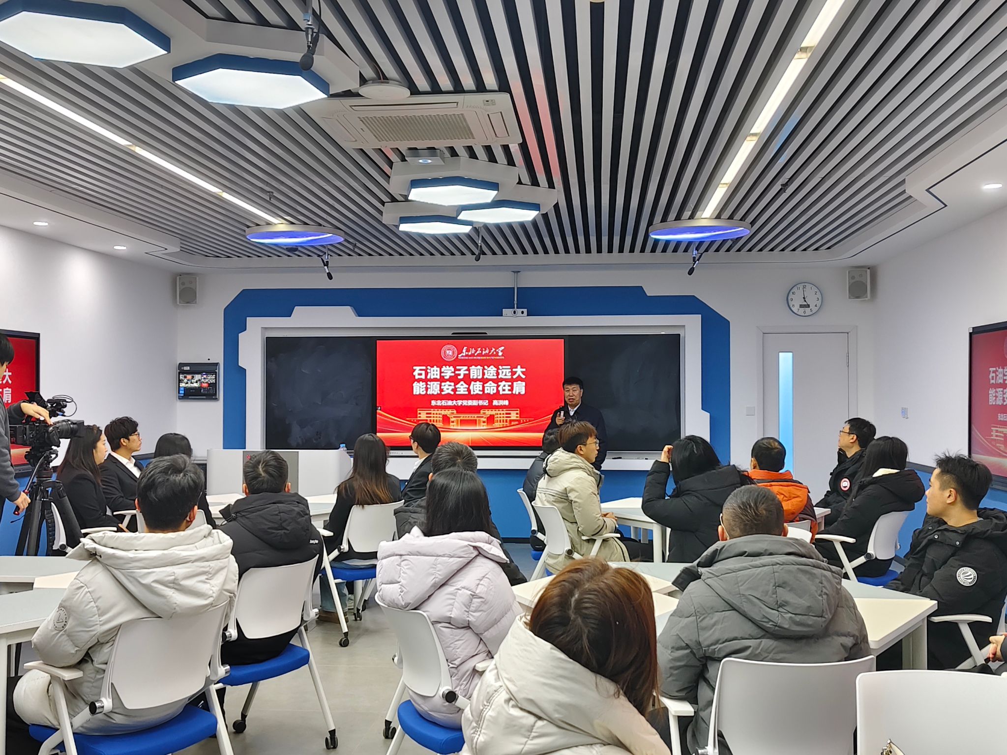 校党委副书记高洪峰以“能源报国”思政课开篇,为学子们筑牢思想根基。非常规油气研究院院长柳波向师生系统地介绍页岩油勘探的发展历程及学校在该领域的科研突破。学生们深入实验室开展观摩学习,直观感受科研攻关的艰辛与坚守,我院学生代表麻泽宇在交流中表示,将牢记初心使命,把专业知识转化为报国行动,为能源事业发展添砖加瓦。