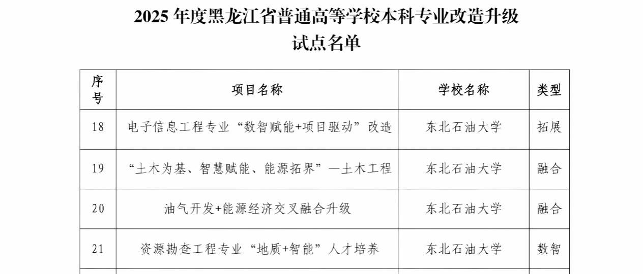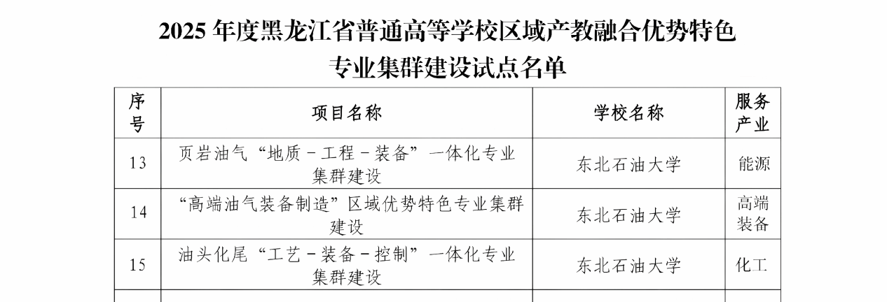 近日,黑龙江省教育厅发布《关于开展高等教育综合改革首批试点的通知》。我院地质资源与地质工程学科相关领域入选全省“101计划”增补试点项目、资源勘查工程专业入选首批本科专业数智升级改造试点项目。此外,我院还支撑页岩油气“地质-工程-装备”一体化专业集群入选全省区域产教融合优势特色专业集群建设试点项目、能源科学与工程学院入选全省人才培养改革实验区建设试点项目。