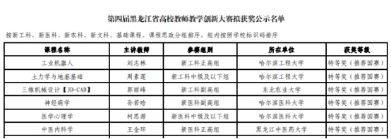 据悉,按照中国高等教育学会《关于举办第四届全国高校教师教学创新大赛的通知》要求,此次黑龙江赛区共有14个国赛推荐名额,经专家组评审,共评选出14个教师(团队)获特等奖并拟推荐参加国赛,43个教师(团队)获一等奖、73个教师(团队)获二等奖、130个教师(团队)获三等奖。