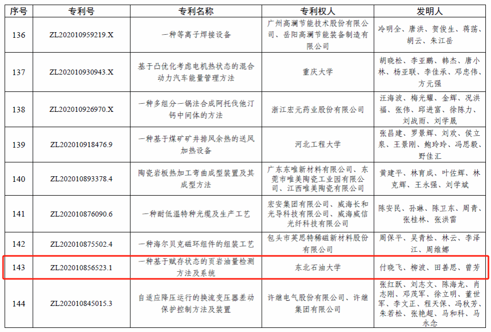 6月5日,国家知识产权局发布《国家知识产权局关于第二十五届中国专利奖授奖的决定》。我校付晓飞教授团队的发明专利“一种基于赋存状态的页岩油量检测方法及系统”(专利号:ZL202010875502.4)荣获中国专利优秀奖。截至目前,我校累计摘得中国专利金奖1项、优秀奖5项。