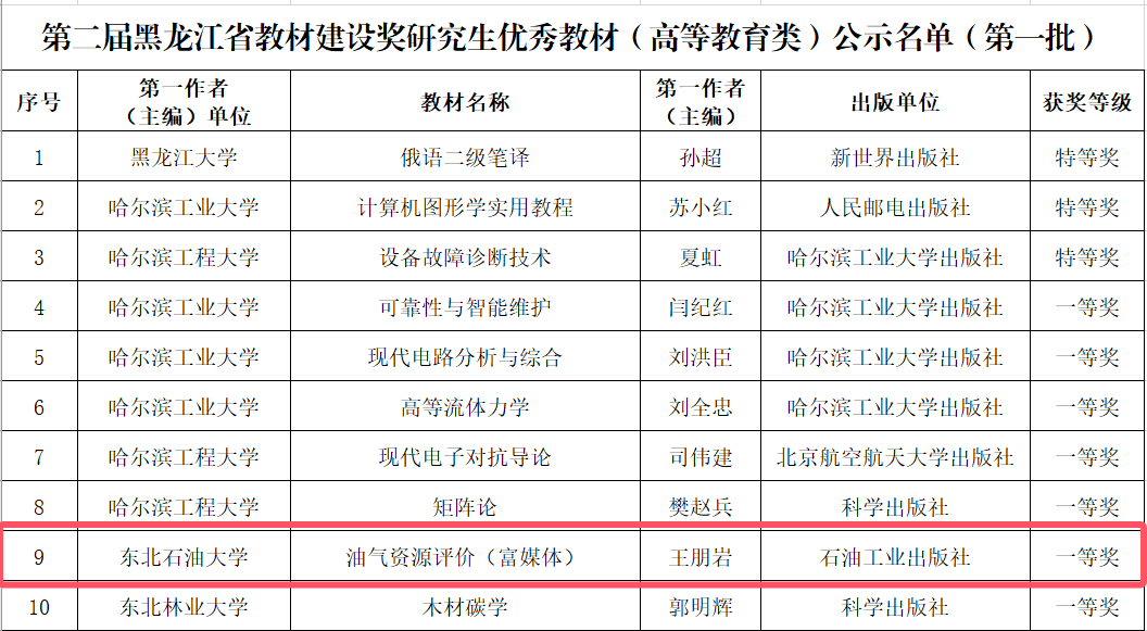 近日,黑龙江省教育厅发布了《关于拟认定第二届黑龙江省教材建设奖优秀教材(高等教育类)名单(第一批)的公示》,经各高校申报、专家严格评审,全省共评选出30部获奖研究生优秀教材(其中特等奖3部、一等奖10部、二等奖17部),我院有1部教材荣获省级研究生优秀教材一等奖。