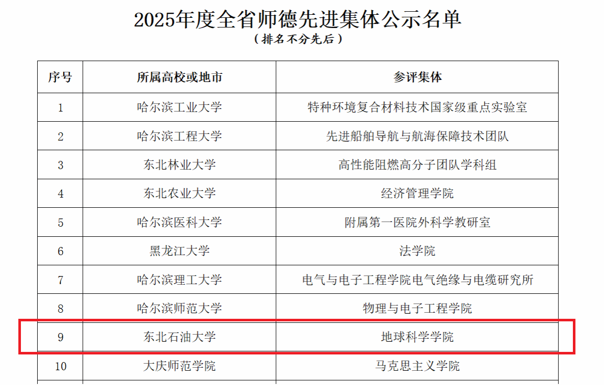 地球科学学院始终坚持以习近平新时代中国特色社会主义思想铸魂育人,坚守为党育人、为国育才的初心使命,将实施新时代立德树人工程作为立院之本,坚持育人为本、人才优先、学科引领、特色发展。学院坚持强化党建引领,立足国家“五大安全”战略定位,培育“全国高校黄大年式教师团队”,打造“全国党建工作样板支部”,获批全省公办高校党建工作“标杆院系”创建培育单位;深化“课程思政”建设,大力弘扬大庆精神,实现课程思政高质量全覆盖,践行“向坤问道、正心笃行”的院训,培养的学生超过80%扎根能源一线,涌现出全国劳模等优秀校友;高度重视师资队伍建设,统筹规划、科学布局,引导教师以德立身、以德立学、以德施教,为服务国家能源战略和龙江振兴展现了卓越的师德担当与育人实效。
