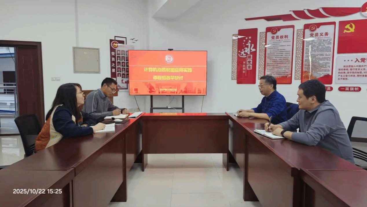 20251022日,《计算机地质制图应用实践》课程教学团队在地科馆610开展了教学研讨活动。课程组成员王朋岩、胡欣蕾、魏华彬、杜先利参会,王朋岩主持会议。