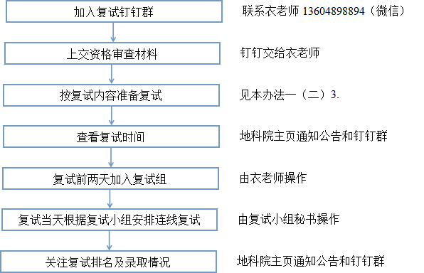 复试拟采用“钉钉”平台,请考生提前下载、注册、熟悉操作。所有考生需联系衣老师13604898894(微信同号)进入“2020年参加地科院复试考生”钉钉群,上交资格审查文件,收取复试相关具体通知。