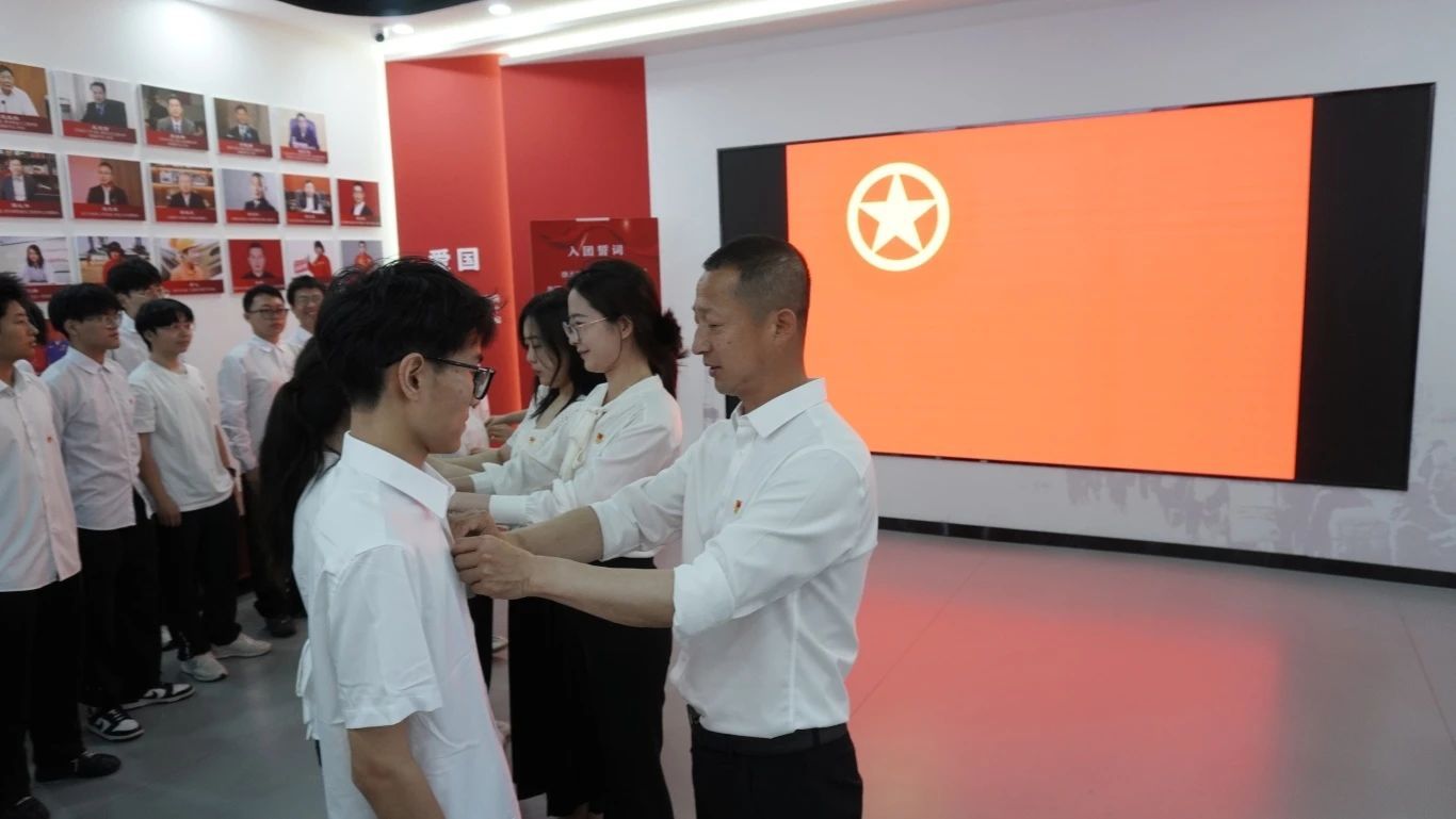 宣讲结束后,全体成员肃立,面向国旗齐声高唱中华人民共和国国歌。在庄重的氛围中,老师们郑重地为新团员佩戴上熠熠生辉的团徽。这枚徽章不仅是共青团员光荣身份的象征,更是沉甸甸的责任与时代使命的传递。随后,全体新团员面向鲜红的团旗立正,在领誓人的带领下,紧握右拳庄严宣誓,铿锵有力的誓言在大庆精神育人展馆内久久回荡,诉说着青春许国的赤诚与决心。宣誓完毕,全体成员面向团旗共唱团歌《光荣啊,中国共青团》。