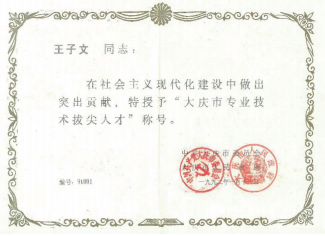1992年王子文获得“大庆市专业技术拔尖人才”称号